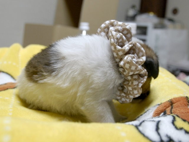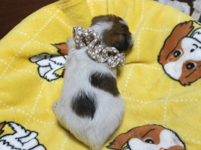 | コメント | お父さんJKCチャンピオン(原光一さん所有)、お母さんキャンちゃんから生まれたダンディーな男の子です。 (茶白リボン君) |