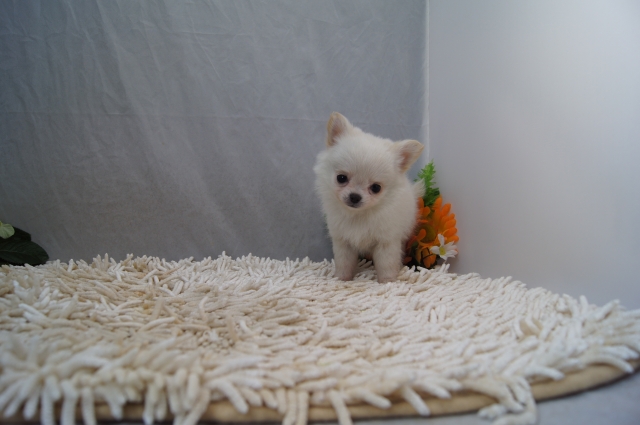 | コメント | ☆とってもとってもカワイイ超超超極小サイズ!超超超激カワ♪のクリームの女の子ちゃんのご紹介です☆ 大きいクリクリまん丸おめめ!お顔のとってもカワイイ超超超激カワちゃん(^^)♪ 毛量たっぷりモコモコフワフワ♪本当のロングコートでとってもとってもカワイイでしょ(^^)♪ 女性の片手のひらサイズのとっても小さい超超超極小サイズ!! お鼻もとっても短く、お顔もとっても詰まっていてオデコも張っていてチワワちゃん理想のアップルヘッドですよ♪ おててもとってもと~っても短くて本当にとってもカワイイですよ(^^)♪ 全体のバランスのとれたスーパーモデル級のスタイルですよ!! ☆モコモコフワフワの超超超極小!超超超激カワ!の女の子ちゃん!!当方一押しの女の子ちゃんです!!☆ 性格も◎すごく良く、甘えたで、人間がとっても大好きでシッポフリフリしながら歩いた後をちょこちょことついてくるとっても人懐っこい性格です(^^)♪ ゲージ内でのおトイレは、ほぼ完璧ですのでゲージ外でのおトイレもすぐに覚えてくれることと思いますよ!!! 2月24日現在(生後54日) 現在 340gです!とってもとっても超超小さい女の子ちゃんですよ! この月齢でこの体重は本当にとってもとっても小さいですよ!! 小さいですが、とっても元気ですっごくカワイイ癒し系の女の子ちゃんですよ♪ ●父:ブラッククリーム ← この子の父方の父JKCチャンピオンお爺さんもJKCチャンピオン曾お爺さんもJKCチャンピオンとアウトスタンディングサイヤー、母方のお爺さんインターナショナルチャンピオンとJKCチャンピオン曾お爺さんもJKCチャンピオンでとってもとっても良血統ですよ!! ●母:ホワイト&クリーム ←この子の父方の曾お爺さんJKCチャンピオン、母方のお爺さんJKCチャンピオン曾お爺さんインターナショナルチャンピオンとJKCチャンピオンでとってもとっても良血統の血筋ですよ!! 両親共にとっても良血統ですよ!! 現在、お腹いっぱいしっかり食べていて元気に遊んでいます♪ 健康状態もバッチリ◎良好です。 ご飯の食べもとっても良い仔なので、ワンちゃんをはじめてお育てになるお客様も安心してワンちゃんをお迎え頂けますよ♪ 1回目の5種ワクチン、血統書代、フード800g、ミルク、おもちゃサービスさせて頂いております!! 当日のご見学にもできる限りご対応させて頂きますので、どうぞ お気軽にお問い合わせ下さいませ。 ご質問やご相談などもお気軽にお問い合わせ下さいませ。 最寄り駅は南海高野線北野田駅です。 駅からは徒歩10分程度です!! 駐車場も完備致しておりますのでお車でもお気軽にお越し下さいませ。 |