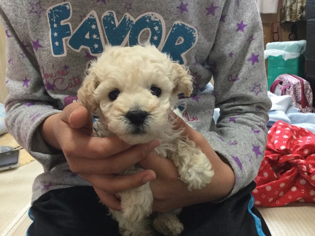 可愛いトイプードルを我が家に連れて来ることができて ほんとに良かったです‼ 白石ブリーダーは大変親切でエサのことや今度のワクチンのことなど丁寧に教えて下さりました。 我が家の家族になって今日で4日めですが 初日から夜も良く寝てくれます。これもブリーダーさんの環境のお陰だと感じています。本当にありがとうございました‼ (北海道 女性)