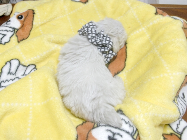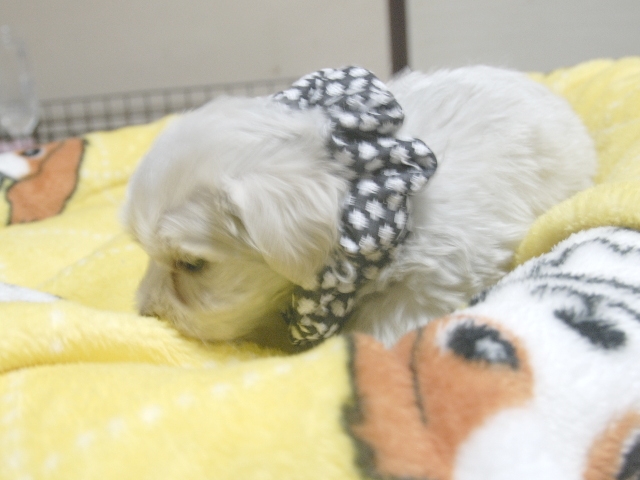 | コメント | とても可愛いキュートな女の子です。(黒リボンちゃん) お父さんビアンコ君、お母さんリンリンちゃんです。 噛み合わせはまだ確認できません。 お曲がり、でべそ、ミスカラー等はありません。 |