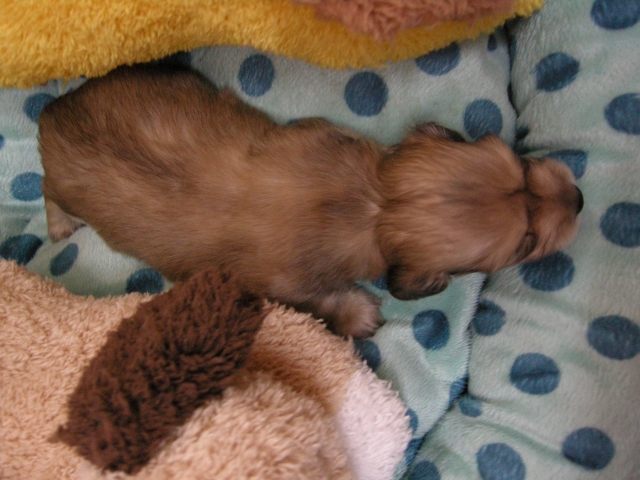 この度は可愛いカニンヘンダックスの女の子を譲っていただきありがとうございます。濱田さんのところからのお迎えは2頭目で、可愛さは初めの子でわかりすぎるほどわかっていたので絶対可愛くなること間違いなしで決めさせていただきました。 どんなことでも相談してくださいねと言う心強い言葉や、可愛い動画を送っていただいたりと本当によくしていただけました。 ワンちゃんは初日からアイコンタクトばっちり、よく食べ、よく寝て、元気いっぱいです。 家にきて1週間、先住犬と遊びながら元気に成長中です。 またよろしくお願いします。(大阪府 女性)