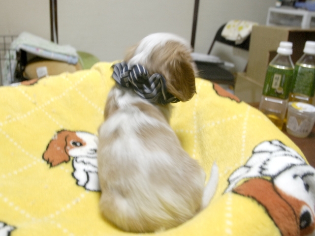 | コメント | お父さんがJKCチャンピオンの頼朝君、お母さん小柄なチャンピオン直子のジュンちゃんから生まれたダンディーな男の子です。(紺リボン君) 可愛いですよ。 噛み合わせはまだ確認できません。 お曲がり、でべそ、ミスカラー等はありません。 チャンピオン直子 |