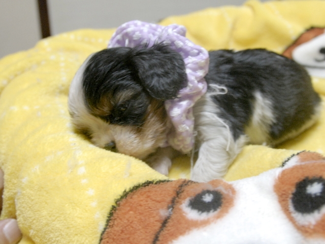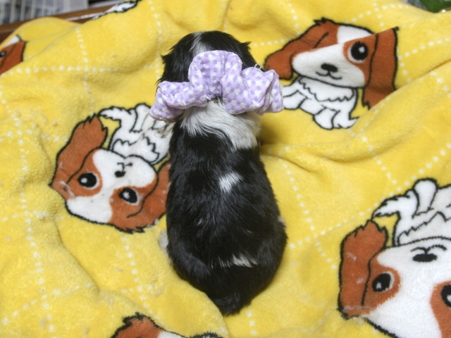 | コメント | お父さんがJKCチャンピオンの家重君、お母さん小柄なチャンピオン直子のスカーレットちゃんから生まれたキュートな女の子です。(紫リボンちゃん) 可愛いですよ。 噛み合わせはまだ確認できません。 お曲がり、でべそ、ミスカラー等はありません。 チャンピオン直子 |