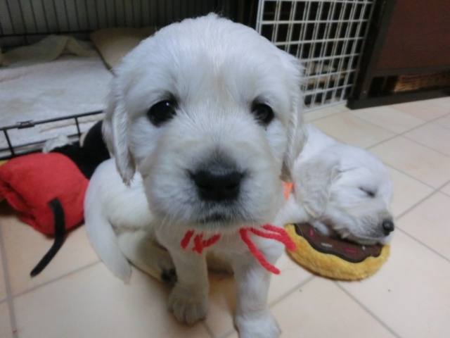 | コメント | 英国ゴールデンの女の子です。 生後1か月が過ぎました。 パパワンコは外資出身で、とてもフレンドリーな可愛い子です ママワンコの血族にも外資出身がおります。ママワンコは可愛らしい性格の綺麗な子です。 お顔はママの小さなころに良く似ています。 とっても可愛いです。 |