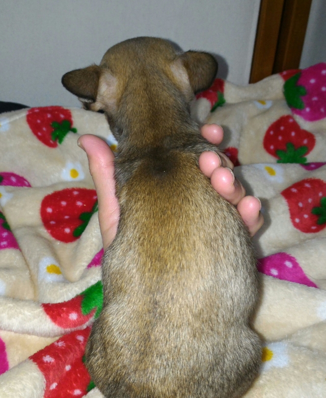 | コメント | 2月4日生まれの、女の子で 現在650グラムです。 将来的には、2キロ位の 体重を予想しています。 スムースですので、見た目は ロングちゃんの2キロの女の子より 小さく感じられるかも知れません。 6種混合ワクチン1回接種済みです。 兄弟共よく遊び、食欲もあります。 食事は1日2回になっています。 トイレもほぼシーツで出来ていますので 成長共に、良い方向にいくと思います。 元気な子ですが、 もの静かな一面もあり 無駄吠えの無い子です。 新しい環境に慣れる期間だけでも ご不在の時間が長く無いオーナー様の ご縁を希望しています。 |
