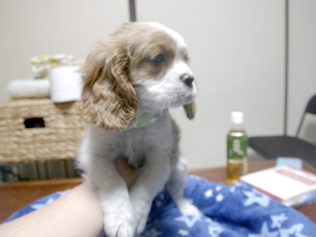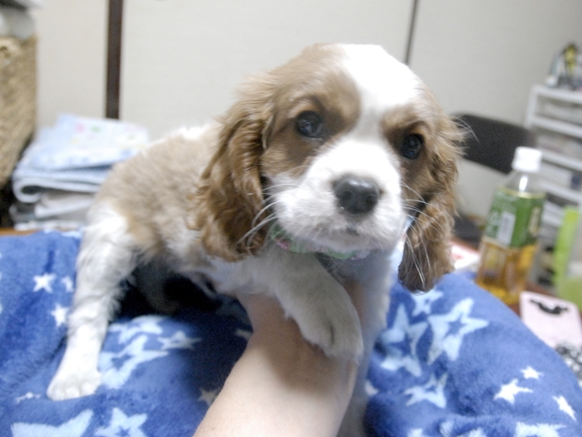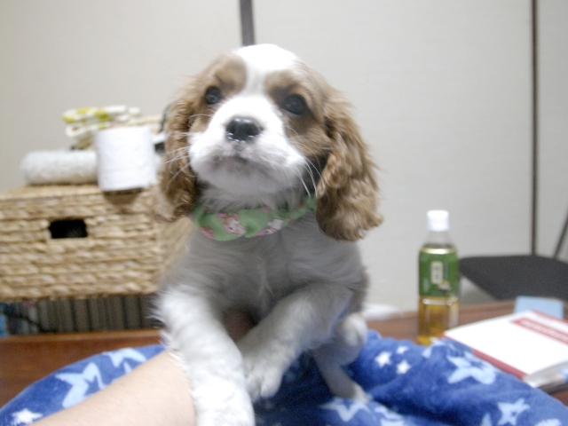 | コメント | お父さんがJKCチャンピオンの頼朝君(ブレンハイム)、お母さんがチャンピオン直子のダイアナちゃん(ブレンハイム)から生まれたダンディーな男の子です。(緑リボン君) 欠点は現時点でありません。 しつけはまだです。 益々可愛さ出てきました。 1回目のワクチン接種しました。(当犬舎負担です) 健康診断も済んでおりますが。 お渡しの際は、もう一度、獣医師の健康診断を行います。 |