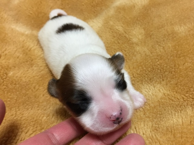 | コメント | 父犬…JKC.CH直息子 母犬…JKC.CH直娘 三姉妹の長女で誕生しました。 両親小柄で2.5kg前後です。 生後50日目の体重は約1.1kgでした。 成長予想は平均的なパピヨンサイズかな? それとも、両親に似て小柄なパピヨンかな? あくまでも予想になりますので、 もっと小さいサイズかもしれません。 大きく育つかもしれません。 その部分はご理解いただきたいと思います。 お耳に若干の白毛が入っています。 お顔はママに似て綺麗な美人さんです。 愛嬌のある性格の子です。 お引き渡しは1回目混合ワクチン接種以降になります。 見学は大歓迎です。 本犬、親、お身内ワンコさんとも触れ合っていただきたいと思います。 ワクチン接種済みでご見学の場で決めていただけて、 そのままお持ち帰りの対応もさせていただきます。 その場合は譲渡金額のご用意もお願いします。 遠方の方で、後日お返事でお迎えを決めていただい場合のみ、 空輸又はご自宅までお届けさせていただきます。 その場合は交通費(高速代)、ガソリン代、諸経費等のご負担をお願いいたします。 その他詳しくはお問い合わせメールの返信メールに当犬舎の譲渡規約を添付させていただきます。 よくお読みになっていただきたく思います。 |