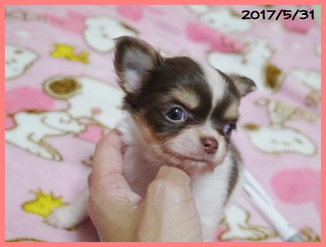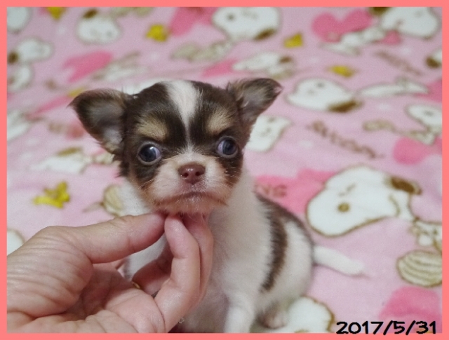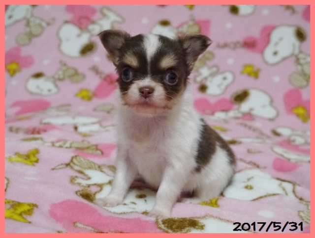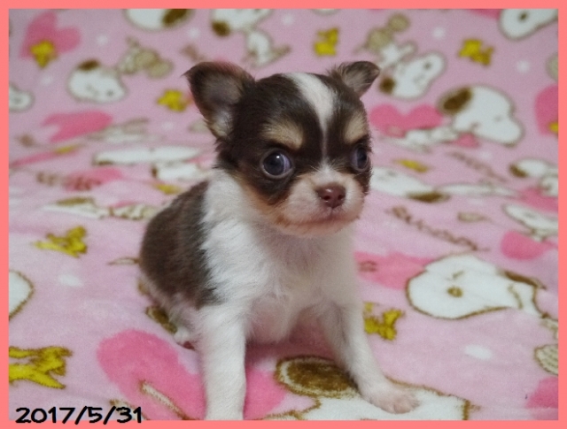 | コメント | とてもコンパクトサイズで、犬質の高いかわいらしいチワワちゃんです。 パパはJKCチャンピオン直子の北斗【ほくと】君(フェイマス君孫)で2.3キロ。 ママはJKC、カナダ、アメリカチャンピオン直娘でのモンタンちゃんで1.8キロ。 両親共に小ぶりで血統の良い、とても性格の人懐こいかわいらしい子です。 2頭兄妹で、帝王切開にて出産しました。母子ともに健康で元気に順調に育っています。 良いご縁がありますように、、、、お問い合わせをお待ちしております。 |
