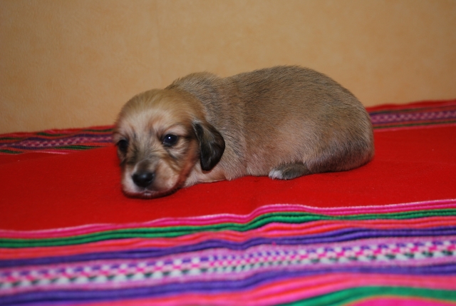 | コメント | とってもかわいいミニチュア・ダックスフンドの男の子 カラーはシェイテッドクリームです。 5月13日現在の体重 680g お引き渡しは6月中旬頃になりますがご予約承ります。 ワクチン1回分 5,000円は別途お願い致します。 |