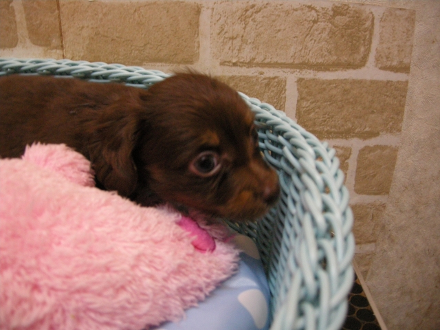 この度は可愛いカニンヘンダックスの女の子を譲っていただきありがとうございます。濱田さんのところからのお迎えは2頭目で、可愛さは初めの子でわかりすぎるほどわかっていたので絶対可愛くなること間違いなしで決めさせていただきました。 どんなことでも相談してくださいねと言う心強い言葉や、可愛い動画を送っていただいたりと本当によくしていただけました。 ワンちゃんは初日からアイコンタクトばっちり、よく食べ、よく寝て、元気いっぱいです。 家にきて1週間、先住犬と遊びながら元気に成長中です。 またよろしくお願いします。(大阪府 女性)