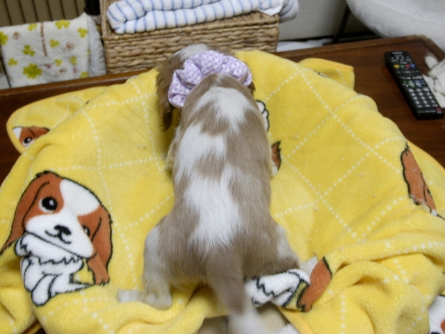 | コメント | お父さんはJKCチャンピオンの吉宗君(ブレンハイム)、お母さんがチャンピオン直子のエンジェルちゃん(ブレンハイム)から生まれたキュートな女の子。 (紫リボンちゃん) 現時点では欠点は見つかっていません。 |