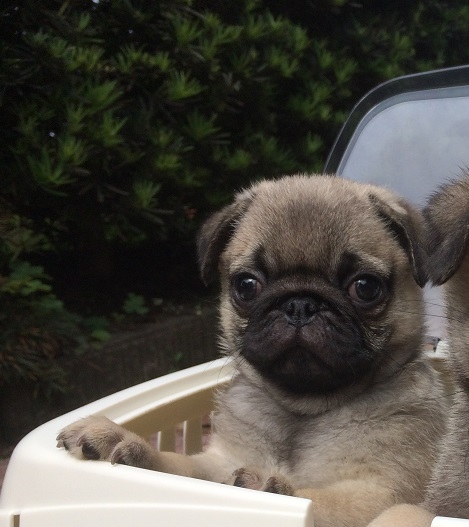 待ちに待った、超元気で、可愛いパグっ子がやってきました。2年前、12歳になるパグ犬アトムの、父母犬が亡くなり、寂しい思いをしていました。パソコンでパグっ子を見つけては、楽しんでいましたが、その中で、瞳の可愛い女の子を、見つけました。内田さんと、電話で、お話をさせていただき、女性ブりーダーさんの、優しい、親切な対応で、安心して、お願いする事が出来ました。1か月間、沢山の写真や動画、またブログにて、パグっ子の成長を見守ることが出来ました。内田さん、また、ご縁を結んでいただいたブリーダーズ、育て方にも、沢山のアドバイスを頂きました。心から感謝しています。大切に、可愛がっていきます。(愛知県 男性)