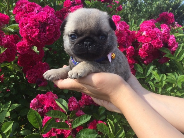 待ちに待った、超元気で、可愛いパグっ子がやってきました。2年前、12歳になるパグ犬アトムの、父母犬が亡くなり、寂しい思いをしていました。パソコンでパグっ子を見つけては、楽しんでいましたが、その中で、瞳の可愛い女の子を、見つけました。内田さんと、電話で、お話をさせていただき、女性ブりーダーさんの、優しい、親切な対応で、安心して、お願いする事が出来ました。1か月間、沢山の写真や動画、またブログにて、パグっ子の成長を見守ることが出来ました。内田さん、また、ご縁を結んでいただいたブリーダーズ、育て方にも、沢山のアドバイスを頂きました。心から感謝しています。大切に、可愛がっていきます。(愛知県 男性)