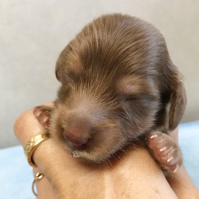 申込から受け取りまでほぼ毎日、仔犬の写真、動画、報告を送って下さいました。縁あって我が家にやって来たのはそれはそれは可愛いい、真にダックスらしく好奇心にあふれ、跳ねまわるほどの元気な仔犬です。大切に育ててくれたに違いありません。このサイトで榎田ブリーダー様に出会って、そして我が家のお姫様に出会えました。ブリーダーズ事務局様、榎田ブリーダー様にも実に細やかな配慮を頂き、感謝で一杯です。有難う御座いました。(北海道 女性)