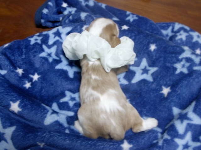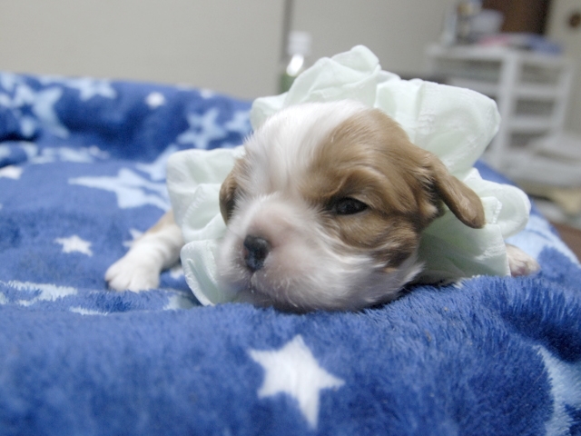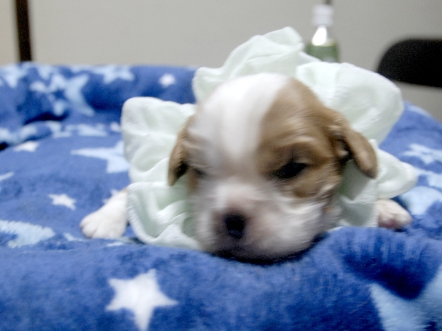 | コメント | お父さんはJKCチャンピオンの吉宗君、お母さんはチャンピオン直子のマーガレットちゃんから生れた3人兄弟の次男です。(白リボン君) |