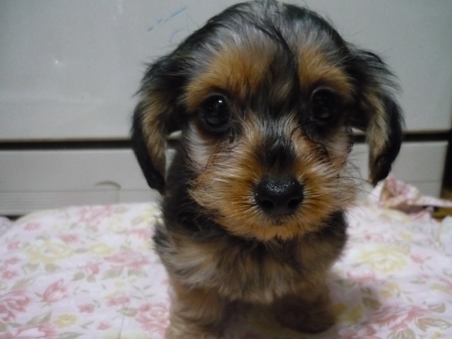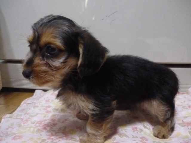 | コメント | 4月11日にダッヨーの赤ちゃんが生まれました(^_^)/~ 150gで生まれ、生後2か月でまだ695g、成犬で3Kぐらいかなと思います。 ママ犬は、賢く人懐こく子育て上手な4kのチョコレート&クリームのミニチュアダックスフンド。 パパ犬はイケメンで優しく、強いスティール&タンの1.5Kの極小ヨーキー 毛色はパパ似でヨーキー、耳はママ似のたれ耳、お顔はイケメンと美犬のミックスかな? 現在はかみ合わせやヘルニア、睾丸などの欠点はありません。 ご飯を催促しますがあとは無駄吠えなく、トイレも賢いです。 この子を家族の一員にして頂ける方を探しています。 宜しくお願い致します |
