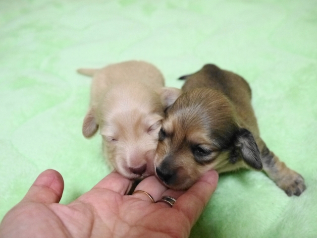 亡くなった愛犬達と同じ、 ワイヤーダックスの子犬を探していましたが、珍しい犬種という事もあり、 なかなか出会えませんでした。 諦めかけた頃、こちらのサイトで可愛い子犬を見つけ、思いきってメールをさせて頂きました。 遠藤ブリーダー様の迅速丁寧な対応で、 お陰様で無事に子犬を迎える事が出来ました。 本当にありがとうございました。 ブリーダーズ様にも感謝致します。 (北海道 女性)