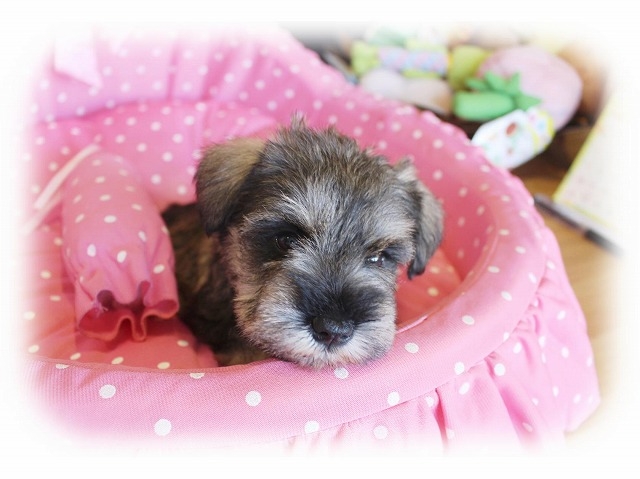 シュナウザーを主力にされているブリーダーさんだと認識しており、ボスちゃんはどうかなあと正直不安でしたがとても可愛く健康的なボスちゃんをいただきました。 掲載されていた写真より実物は想像以上に可愛くて即決し見学させていただいたその日に連れて帰りました。連絡をして、翌日行きますぅって勝手な申し出にも関わらず敏速かつ親切に対応して頂き大満足です。契約に対しても一つ一つ丁寧に説明してくださり、わかりやすかったです。この度は可愛いボスちゃんとのご縁をいただき、本当に有り難うございました。 (大阪府 女性)