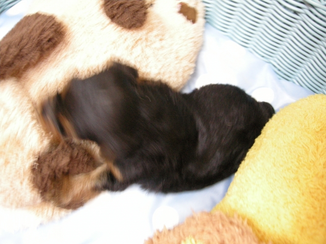 この度は可愛いカニンヘンダックスの女の子を譲っていただきありがとうございます。濱田さんのところからのお迎えは2頭目で、可愛さは初めの子でわかりすぎるほどわかっていたので絶対可愛くなること間違いなしで決めさせていただきました。 どんなことでも相談してくださいねと言う心強い言葉や、可愛い動画を送っていただいたりと本当によくしていただけました。 ワンちゃんは初日からアイコンタクトばっちり、よく食べ、よく寝て、元気いっぱいです。 家にきて1週間、先住犬と遊びながら元気に成長中です。 またよろしくお願いします。(大阪府 女性)