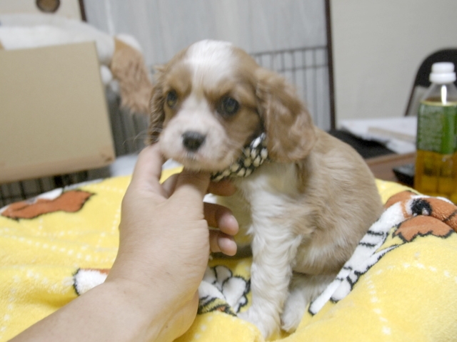 | コメント | お父さんはJKCチャンピオンの頼朝君、お母さんはシンシアちゃんから生れたダンディーな男の子です。(黒リボン君) 健康状態は、問題有りません。 |