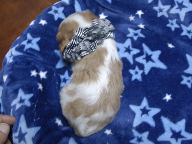 | コメント | お父さんがJKCチャンピオンの家重君、お母さんがチャンピオン直子のマリリンちゃんから生れたダンディーな男の子です。(黒リボン君) 現時点では欠点は見当たりません。 |
