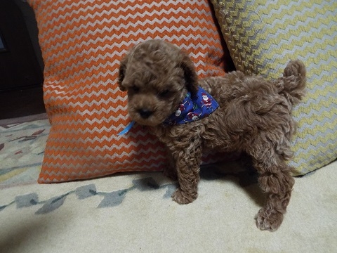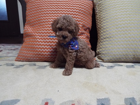 藤澤さんからトイプードルの男の子を譲って頂きました。写真を見て一目惚れし、見学日に契約させて頂き、一緒にお家に帰ってきました。奥さんが対応して下さったのですが、とても親切な方でワンちゃん達への愛情が溢れていました。藤澤さんのお家で育てられたからこその愛嬌と元気溢れるワンちゃん達に本当に驚きました。初めて室内犬を飼う私達にもとても分かりやすく説明をして下さり本当に感謝しています。自宅に連れて帰って来てからも親切に連絡を下さり、出逢えて良かったと心から思っています。(兵庫県 女性)