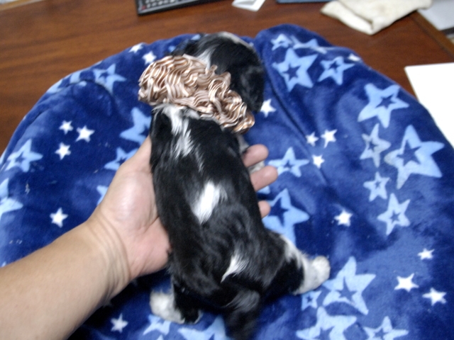 | コメント | お父さんがJKCチャンピオンの家重君、お母さんがチャンピオン直子のマリリンちゃんから生れた可愛いダンディーな男の子です。(茶リボン君) 現時点での欠点等は見当たりません。 |