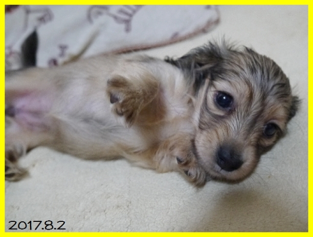 | コメント | 超ハイクオリティな子犬ちゃんです。 パパもママもJKCチャンピオン!おじいちゃんもおばあちゃんも全員チャンピオンという素晴らしい血統のカニンヘンロングダックスの女の子です。 親犬のPRA(遺伝性網膜委縮症)のDNA検査もしておりますので、子犬ちゃんがPRAを発症する心配はありません。 血統も性格も良くお顔のかわいらしいおっとりとした一人っ子ちゃんです。 生まれた時は黒い刺し毛におおわれていますが、成長と共に黒い毛が少なくなっていって、将来的にはきれいなクリーム色のピカピカとした毛色に仕上がります。 耳の先や尻尾にはアクセントの黒い毛が残ると思います。 色素もとてもしっかりとしていて、健康で健全な子犬ちゃんです。 8月20日以降にお迎えいただけますので、お問い合わせをお待ちしております。 |