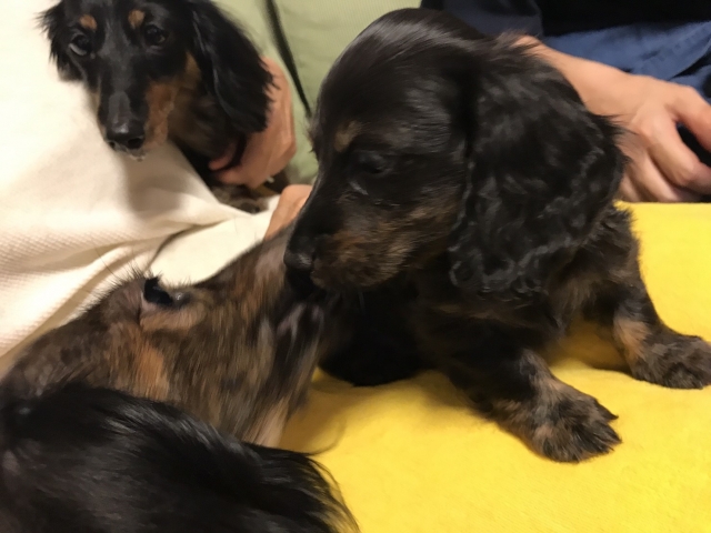 | コメント | 父:現役セラピー活動中(ブラックタン)、ドッグショーチャレンジ中。父JKCチャンピオン、母セラピー犬。3.8キロ。 母:4世代に渡り、英国産ショー血統&賢くおだやかなセラピードッグの血統。 (希少な英国産ブリンドルの血を濃く受け継ぐ美しいレッドブリンドル)3.4キロ。父インターチャンピオン。母JKCチャンピオン。 英国ダックスフンドの血統を大切にし、初代はイギリスにて認定され活動したセラピー犬。当血統同士の理想を目指した子犬です。 ☆生後1カ月健診時、体重500g。2か月健診時1.2キロでとても小ぶりですが健康問題なし。 離乳食(良質のFish4パピー)もよく食べ、兄弟で遊んだり、お部屋を走ったりオモチャ遊びを始めたり、好奇心も育っています。トイレシーツで排せつも90%できつつあります。 カニンヘンダックスとしても小ぶりですが、 現在生後2カ月を過ぎ、お部屋をオモチャ遊び、すばやく駆け回っています。 英国系の特徴であるマズルの太さ、脚の太さ、お顔のかわいらしさが見られます。 ☆父PRA遺伝病DNA検査済クリアのため、この子は発症しません。 ☆当方家庭犬トレーニングスクールを主宰していますので、生まれてから2カ月のお引き渡しまで、犬への社会性、家庭内で清潔に人と暮らす環境で育て、トイレトレーニング、甘かみの矯正も行っており、これまで譲渡した子は甘がみも少なく、社交性が高く最高の家庭犬として皆暮らしております。 ☆当ケネルは2,3年に一度熟慮の上の繁殖で数は少ないのですが、繁殖譲渡犬は、訓練試験中等科・初等科合格5頭、セラピー犬5頭、ドッグスクール先生犬1頭と性格の良さ、賢さが際立ちます。 ☆ぜひ当ケネルへお越しいただき、ファミリーの性格や環境をご覧いただいたうえで、直接面会をお願いできれば嬉しいです。 この子の5世代の血縁犬…祖先犬の曾々祖父(英国産17歳)曾祖父(英国産14歳)曾祖母ほか(JKCチャンピオン2頭)会っていただけます。 ☆☆譲渡時に含まれるもの:生まれてからの写真等を収めたCDアルバム、育て方&健康ファイル(トレーナーとしての子犬の育て方アドバイス、ワクチンや健診の記録)、JKC血統書(費用は当方にて負担)、2週間分フード |