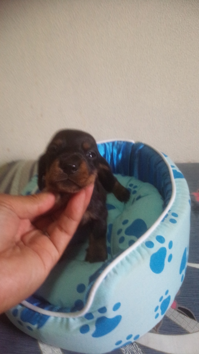 ミニチュアダックス スムース ブラックタンの子犬を探しまくる中、ブリーダーズさんのサイトから上山ブリーダーさんに辿り着きました。問合せ後すぐに連絡を頂き訪問に至る迄の間、度重なる問合せにメール、電話にて毎回本当に親切丁寧にお応え頂きました。神奈川県からでしたが安心して伺う事ができました。子犬対面当日は…なんと可愛い子犬でしょー!毛も艶々で元気いっぱいです!子犬、親犬の事やお世話の仕方、持ち帰り時の注意点等詳しく教えて頂き大切に育ているんだなぁと実感しました。連れ帰った後も子犬の状態を気にして連絡を下さいました。これからも相談させて頂こうと思っています。親切で知識も豊富な信頼できるブリーダーさんです。今回は元気で可愛い子犬をありがとうございました。(神奈川県 女性)