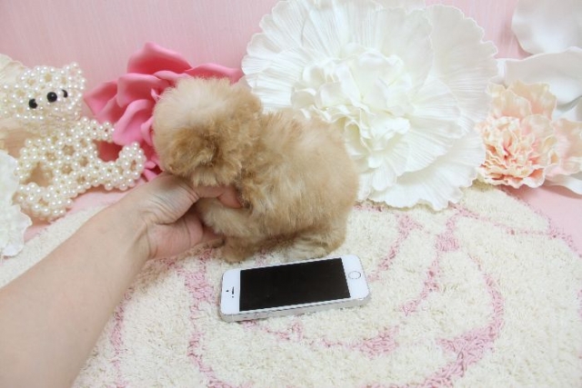 | コメント | 8月10日撮影 生後80日で310gのとっても小さいサイズの Tカッププードル♪ お顔まんまる! とっても可愛いRoseちゃん! 毛量も小さいながらもとても多め!!! 手足もかなり短い!ドアーフタイプ♪ 胴もすっごく短くて、、、 参考程度にiphone5の携帯置いてみました^^ 画像より動画の方がわかりやすいので ぜひ合わせて見てくださいね^^ でもでも実物の方がはるかに可愛いですよ! マイクロサイズのTカッププードルお探しの方 ぜひお早目にお問い合わせくださいね♪ 性格は人なつこい明るい性格です。 8月10日現在 生後80日で体重310gです。 成犬時予想体重は1kg未満~1.2kg前後の 超極小 マイクロサイズのTカッププードル予想です。 父 1.5kg 母1.7kg 1回目のワクチンは接種済みです。 |