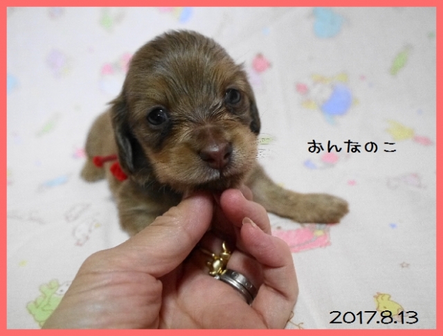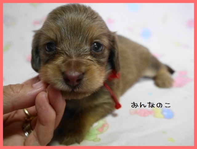 亡くなった愛犬達と同じ、 ワイヤーダックスの子犬を探していましたが、珍しい犬種という事もあり、 なかなか出会えませんでした。 諦めかけた頃、こちらのサイトで可愛い子犬を見つけ、思いきってメールをさせて頂きました。 遠藤ブリーダー様の迅速丁寧な対応で、 お陰様で無事に子犬を迎える事が出来ました。 本当にありがとうございました。 ブリーダーズ様にも感謝致します。 (北海道 女性)