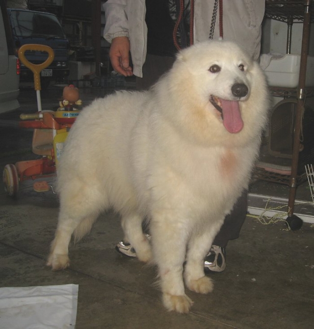 | コメント | 仔サモちゃんの幼児期は本当に可愛いです。 余りにも可愛いので、ついつい抱きしめたくなる可愛さ・・・ 後、男の子が1頭。種オスとして残しても良いけど 今、2歳になる外産の種オスが居てるので考え中” 毛も純白だし今の所は、これっと言っての目立つ欠点はありません。 食欲旺盛で、兎に角元気です。 両親の性格が良いので、この仔もおそらく両親に似て良い子に育つと思います。 骨量あり幅あり半端ない毛量ありで大きくなると見栄えがとても良く キレイなワンちゃんに仕上がると思います。 又、婆ちゃんのグランちゃんの血筋は5代目迄、全員61頭がAmch 取得件犬です。素晴らしいです。又、メスなのに38kg の体重がダイエットで36kg とオスなみのデッカイ婆ちゃんです。 本当に可愛いいのでよろしくですぅー。 又、何なりとお尋ね下さいね” |