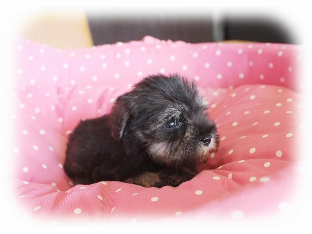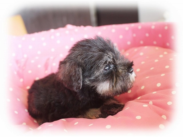 シュナウザーを主力にされているブリーダーさんだと認識しており、ボスちゃんはどうかなあと正直不安でしたがとても可愛く健康的なボスちゃんをいただきました。 掲載されていた写真より実物は想像以上に可愛くて即決し見学させていただいたその日に連れて帰りました。連絡をして、翌日行きますぅって勝手な申し出にも関わらず敏速かつ親切に対応して頂き大満足です。契約に対しても一つ一つ丁寧に説明してくださり、わかりやすかったです。この度は可愛いボスちゃんとのご縁をいただき、本当に有り難うございました。 (大阪府 女性)