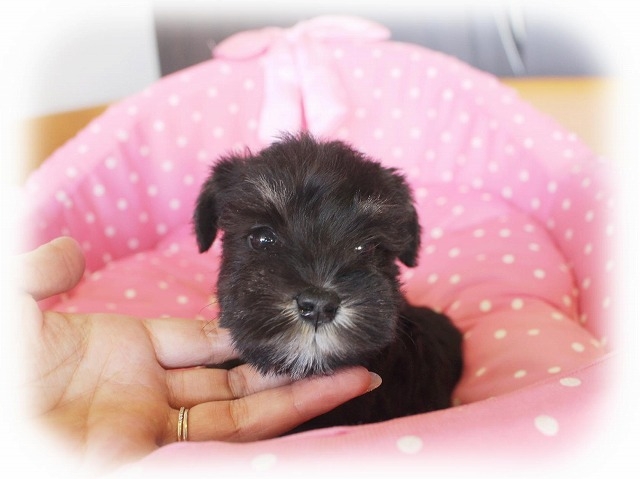 シュナウザーを主力にされているブリーダーさんだと認識しており、ボスちゃんはどうかなあと正直不安でしたがとても可愛く健康的なボスちゃんをいただきました。 掲載されていた写真より実物は想像以上に可愛くて即決し見学させていただいたその日に連れて帰りました。連絡をして、翌日行きますぅって勝手な申し出にも関わらず敏速かつ親切に対応して頂き大満足です。契約に対しても一つ一つ丁寧に説明してくださり、わかりやすかったです。この度は可愛いボスちゃんとのご縁をいただき、本当に有り難うございました。 (大阪府 女性)