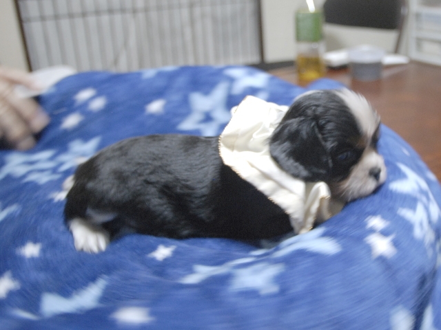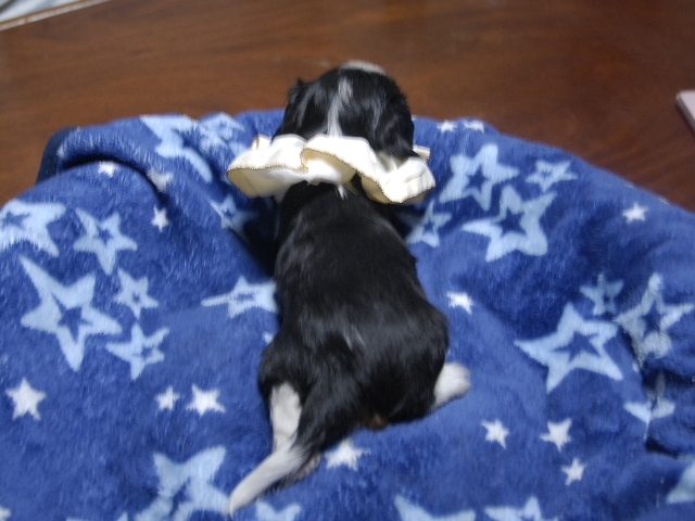 | コメント | お父さんはJKCチャンピオンの家斉君、お母さんはチャンピオン直子のヒンギスちゃんから生れたダンディな男の子です。(白リボン君) 健康状態は、問題有りません。 すくすく育っています。 |