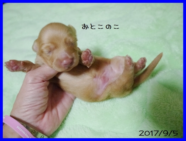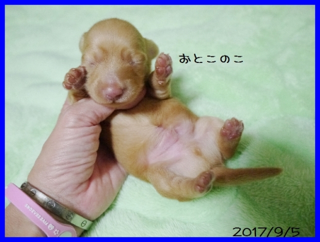 亡くなった愛犬達と同じ、 ワイヤーダックスの子犬を探していましたが、珍しい犬種という事もあり、 なかなか出会えませんでした。 諦めかけた頃、こちらのサイトで可愛い子犬を見つけ、思いきってメールをさせて頂きました。 遠藤ブリーダー様の迅速丁寧な対応で、 お陰様で無事に子犬を迎える事が出来ました。 本当にありがとうございました。 ブリーダーズ様にも感謝致します。 (北海道 女性)