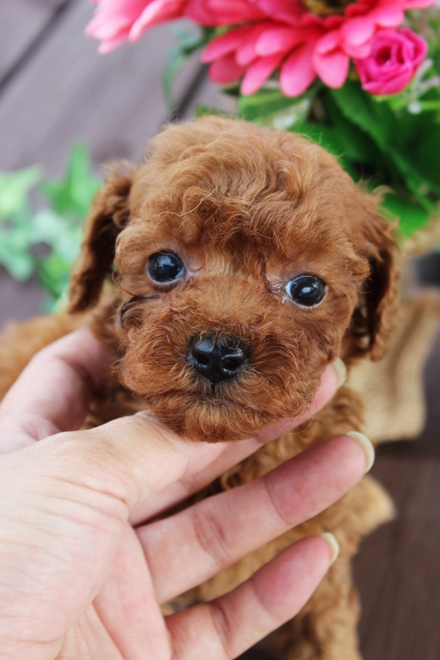 | コメント | タイニーサイズから小ぶりトイサイズ見込みの赤ちゃんです。 クリクリ大きなおメメとマズル短めの可愛らしいお顔をしています。 レッド同士の両親から誕生した色素のしっかりしたお子様です! 将来的なカラーの退色も最低限が期待できます。 好奇心旺盛で人懐っこい子です。 パパは通常トイサイズですが、血統にティーカップが多くいるため、小さい子を産ませる力の強い子です。 とても人懐っこく物おじしない性格です。 濃いレッドです。 ママも通常トイサイズ。 とても甘えん坊で優しい性格をしています。 濃いレッドで成長後のカラーの退色はありません。 お気軽にお問い合せください! |
