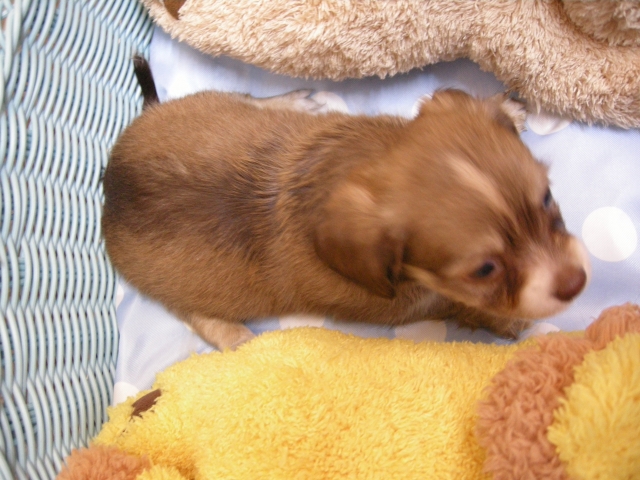 この度は可愛いカニンヘンダックスの女の子を譲っていただきありがとうございます。濱田さんのところからのお迎えは2頭目で、可愛さは初めの子でわかりすぎるほどわかっていたので絶対可愛くなること間違いなしで決めさせていただきました。 どんなことでも相談してくださいねと言う心強い言葉や、可愛い動画を送っていただいたりと本当によくしていただけました。 ワンちゃんは初日からアイコンタクトばっちり、よく食べ、よく寝て、元気いっぱいです。 家にきて1週間、先住犬と遊びながら元気に成長中です。 またよろしくお願いします。(大阪府 女性)