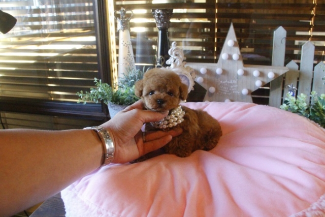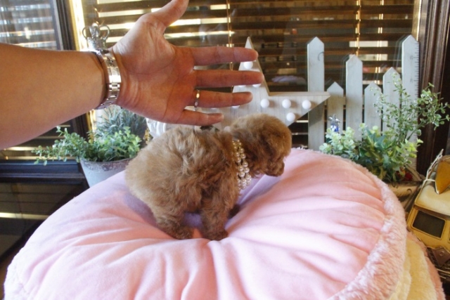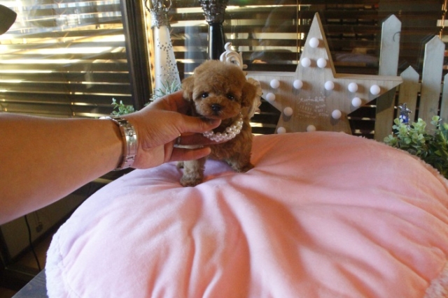 | コメント | 父犬1.2kg 母犬2.3kg 小さなアプリコットの女の子のご紹介です♪ 手の上で寝てしまうような仔で、姿を見たらもうたまらないです( ^ω^ ) 大人しく人懐っこい性格なので初めての方にも飼いやすい仔です☆ ゲージ内でのトイレ、お留守番、夜鳴きはすでにしつけ済みです♪ ペットショップやオークション出しのブリーダーと違い欧米のブリーディング同様、親や兄弟と社会期を過ごさせることで 人間と暮らした時にスムーズに暮らせるようにしております。 親犬達も家族として朝7時からドックランで遊び、全室冷暖房完備の部屋で過ごし、専門のスタッフや専門学校の方々と協力し合いながら 衛生管理に努めております。 犬舎の特徴としましては、東京や神奈川近郊の為マンションのお客様が8割を占めます。その為小さな1キロから2.8キロまでに収まるように、 母犬を2.8キロまでと決めてブリーディングをしている為、後で極端に大きくなる子はいません。 瞳の丸く大きなところやマズル(鼻先)が短いもの特徴で、父犬、母犬、全て私が全国の可愛いトイプードルを一頭、一頭厳選して親犬としてブリーディングした子犬のみを掲載しております。 こだわりとしては、お客様がお迎えされた後、その子がTV出演、雑誌やカレンダーのモデルとして活躍の場が増え我が家を忘れないでいてもらいたい為、 本気でこだわりを持って常にトイプードルを飼うなら此処だと皆様全員に思われる犬舎でありたいと思います。 ありがたいことに今では、雑誌やTV出演、カレンダーなど多くの出身トイプードルちゃんたちが可愛く撮影されお客様からも喜びの声を頂いております。 我が家は35頭の小さな犬舎ではありますが、頭数が多いところでは管理が行き届かない、PRA若年性白内障などの遺伝性疾患の発症がないように努めております |