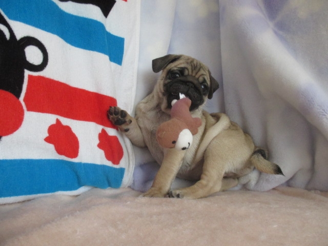 この度、ご縁がありましてパグちゃんを譲って頂きました。 空輸での移動の為、元気に届くかどうか心配しましたが、 手際よく家族として迎えることができました。 この仔をみてると角田ブリーダーによって愛情ゆたかに3ヶ月 育てられてきたことがよくわかります。 我々とともに1日でも長く一緒に居られるように、困った時や患った時にはこれからも、相談させていただこうと思っております。 本当に可愛い仔をありがとうございました。 (神奈川県 男性)