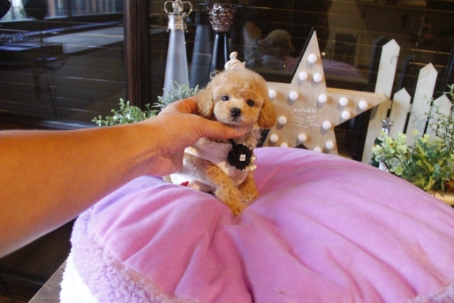 | コメント | 父犬1.2kg 母犬2.3kg 瞳は大きくくりくりのおめめ♥ 毛色もきれいなアプリコット☆ 大人しく人懐っこい性格なので初めての方にも飼いやすい仔です☆ ゲージ内でのトイレ、お留守番、夜鳴きはすでにしつけ済みです♪ ペットショップやオークション出しのブリーダーと違い欧米のブリーディング同様、親や兄弟と社会期を過ごさせることで 人間と暮らした時にスムーズに暮らせるようにしております。 親犬達も家族として朝7時からドックランで遊び、全室冷暖房完備の部屋で過ごし、専門のスタッフや専門学校の方々と協力し合いながら 衛生管理に努めております。 犬舎の特徴としましては、東京や神奈川近郊の為マンションのお客様が8割を占めます。その為小さな1キロから2.8キロまでに収まるように、 母犬を2.8キロまでと決めてブリーディングをしている為、後で極端に大きくなる子はいません。 瞳の丸く大きなところやマズル(鼻先)が短いもの特徴で、父犬、母犬、全て私が全国の可愛いトイプードルを一頭、一頭厳選して親犬としてブリーディングした子犬のみを掲載しております。 こだわりとしては、お客様がお迎えされた後、その子がTV出演、雑誌やカレンダーのモデルとして活躍の場が増え我が家を忘れないでいてもらいたい為、 本気でこだわりを持って常にトイプードルを飼うなら此処だと皆様全員に思われる犬舎でありたいと思います。 ありがたいことに今では、雑誌やTV出演、カレンダーなど多くの出身トイプードルちゃんたちが可愛く撮影されお客様からも喜びの声を頂いております。 我が家は35頭の小さな犬舎ではありますが、頭数が多いところでは管理が行き届かない、PRA若年性白内障などの遺伝性疾患の発症がないように努めております |