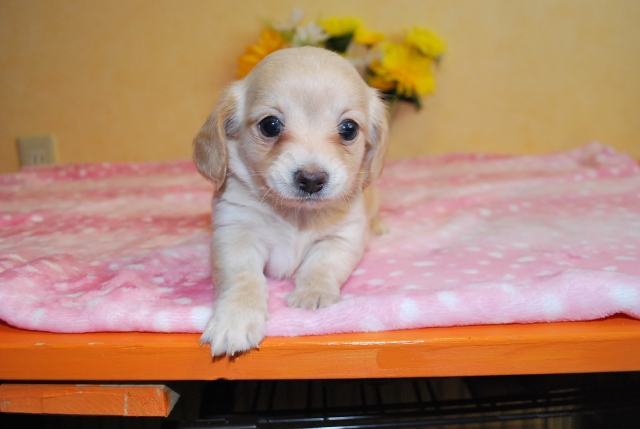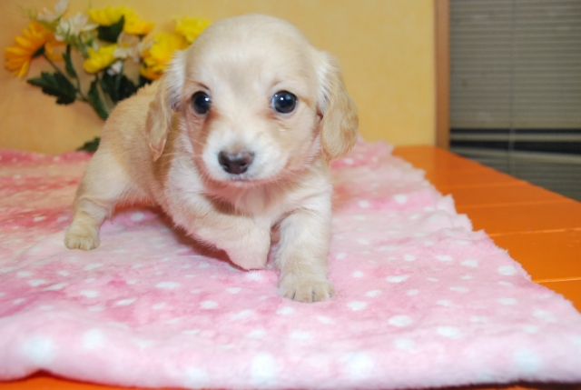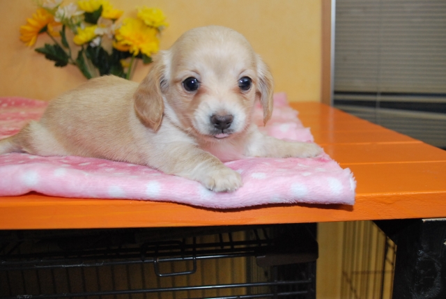 | コメント | ミニチュアダックスのママとチワワのパパから誕生した お目目くりくりのチワックスの女の子です。 一人っ子なのでママの愛情独占! コロコロですごくなつっこい子です。 お引き渡しは11月後半になりますがご予約承ります。 ワクチン1回分(5,000円)は別途お願いします。 |
