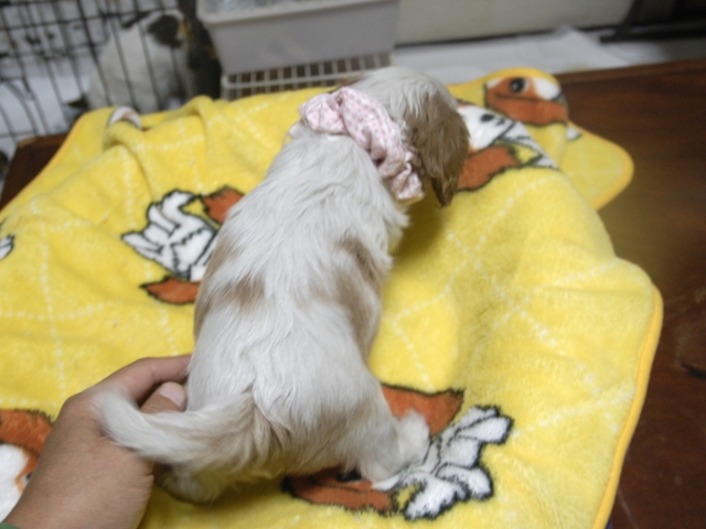 | コメント | お父さんはJKCチャンピオンの家斉君、お母さんはブレンダちゃんから生れたキュートな女の子です。(ピンクリボンちゃん) 健康状態は、問題有りません。 すくすく育っています。 |