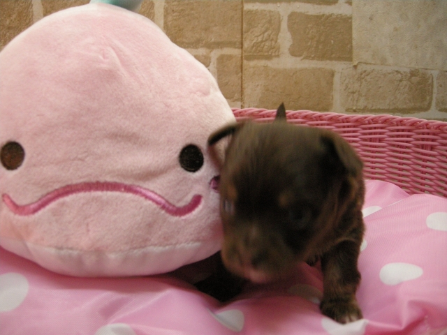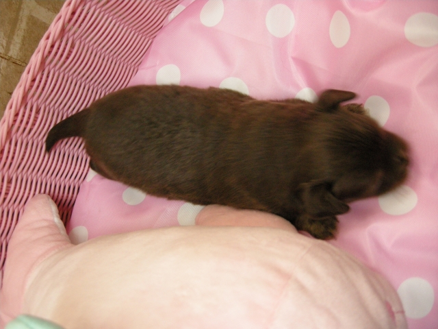 この度は可愛いカニンヘンダックスの女の子を譲っていただきありがとうございます。濱田さんのところからのお迎えは2頭目で、可愛さは初めの子でわかりすぎるほどわかっていたので絶対可愛くなること間違いなしで決めさせていただきました。 どんなことでも相談してくださいねと言う心強い言葉や、可愛い動画を送っていただいたりと本当によくしていただけました。 ワンちゃんは初日からアイコンタクトばっちり、よく食べ、よく寝て、元気いっぱいです。 家にきて1週間、先住犬と遊びながら元気に成長中です。 またよろしくお願いします。(大阪府 女性)