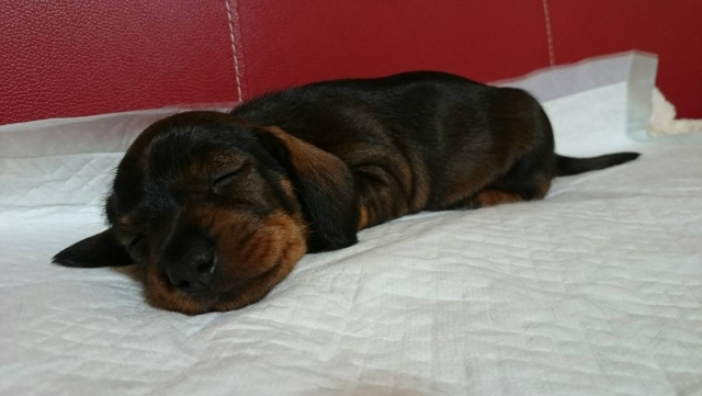 インターネットで犬を買うということに抵抗があったのですが、質問にも迅速に対応していただき、写真を送っていただいたり電話で話をして安心して子犬を迎えることができました。北海道から福岡と長距離だったのですが、家に着いた途端先住犬の2匹のダックスと元気に走り回ってました。とっても元気で愛嬌のあるかわいい子を迎えることができてとても嬉しいです。家に来てからもブリーダーさんから連絡があったり相談にも乗ってもらってます。本当にいいブリーダーさん、かわいい子犬に出会えてよかったです。(福岡県 女性)