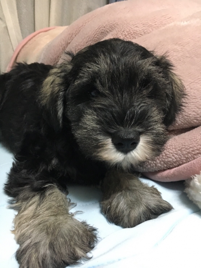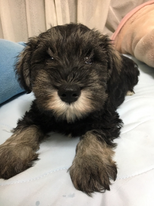| コメント | 温和で大人しい性格の両親犬です、きっとこの仔も良い仔になります。 小さめですが、元気にご飯も食べます!! 両親情報 パパ ソルト&ペッパーママ ブラック&シルバー お顔立ちは整っています。 まだ表情が幼いですが毛が伸びてくると可愛くなると思います。 |