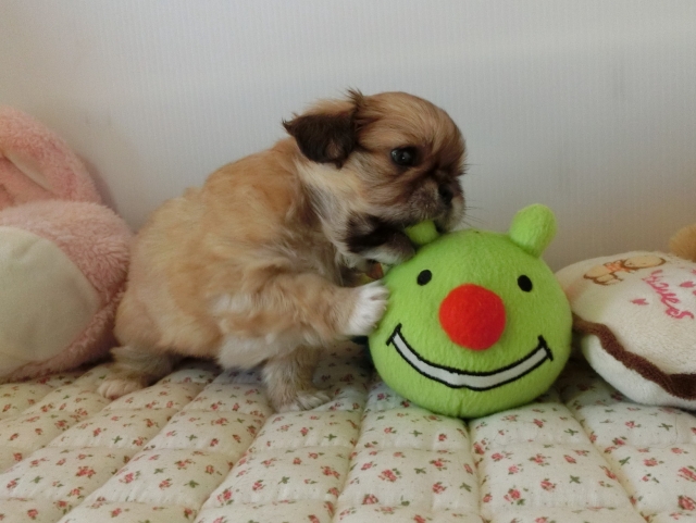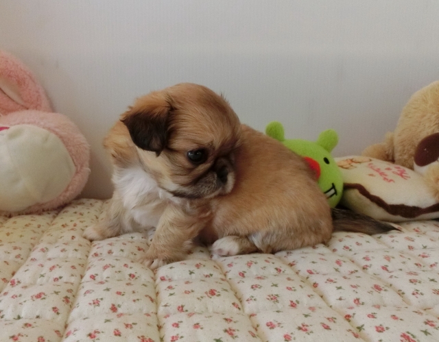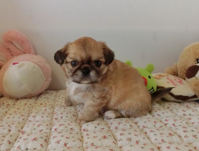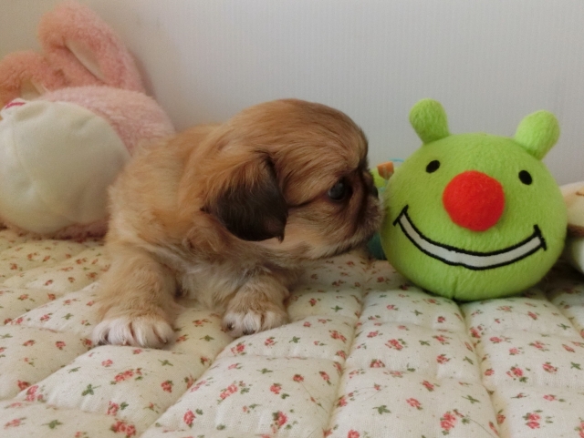 | コメント | ペキニーズのママとチワワのパパから生まれました。 人懐こくて可愛い両親のいいとこ取りです! お鼻ぺちゃんこ、短足でモフモフのとっても可愛いペキチワくん♪ 黒い差し毛はだんだん薄くなって綺麗なレッドになります。 毎日兄妹たちと楽しくじゃれ合いながら社会勉強もしています。 食欲もしっかりありますよ! 実物はお写真よりもずっとずっと可愛い子です! 是非ご見学にお越しください。 |