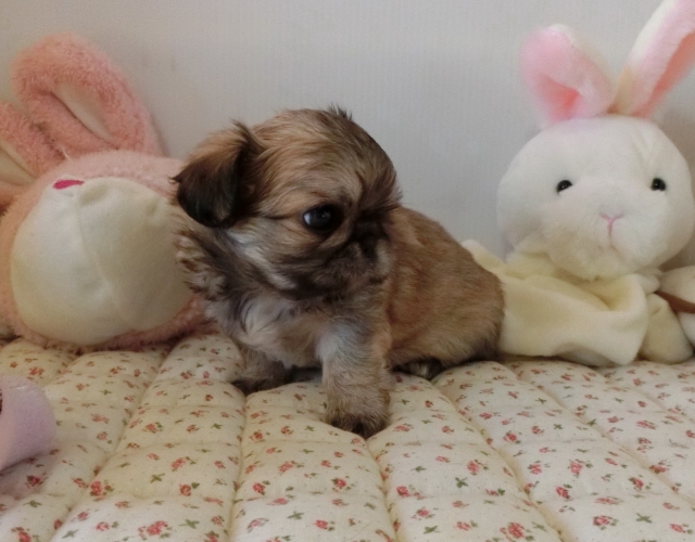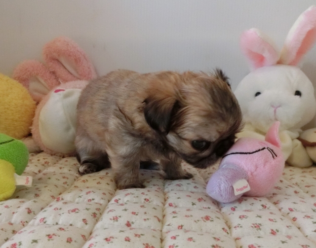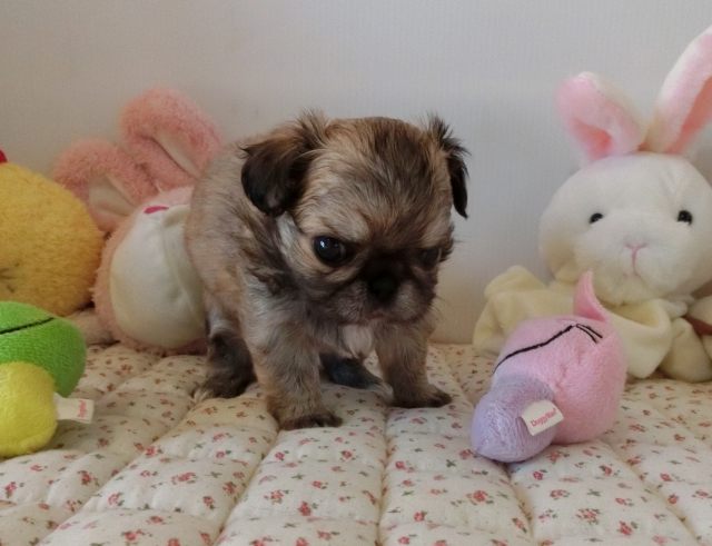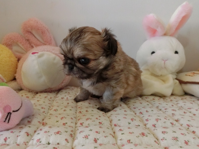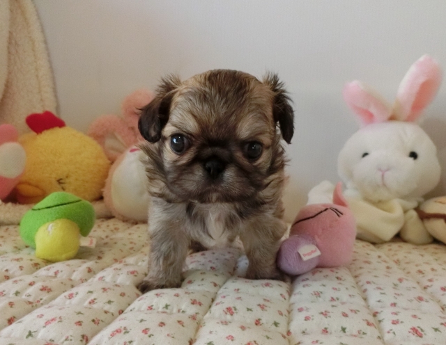 | コメント | ペキニーズのママとチワワのパパから生まれました。 人懐こくて可愛い両親のいいとこ取りです! お鼻ぺちゃんこ、短足でモフモフのとっても可愛いペキチワくん♪ 黒い差し毛はだんだん薄くなって綺麗なフォーンに近いレッドになります。 毎日兄妹たちと楽しくじゃれ合いながら社会勉強もしています。 食欲もしっかりありますよ! 実物はお写真よりもずっとずっと可愛い子です! 是非ご見学にお越しください。 |