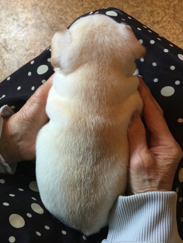 | コメント | まんまるお顔がかわいらしい人気のクリーム男の子です。 父犬はクリーム 母犬はフォーン(JKCCH直娘) 色素もしっかりあり肉球もお鼻も真っ黒です。 小ぶりですが食欲旺盛ですくすくと成長しています。 性格はおっとりさんでとても育てやすいと思います。 見学お待ちしております。 遠方の方でも動画写真送ります。 12/13までの募集となりますので、気になる方はお早目にお問い合わせください。 |